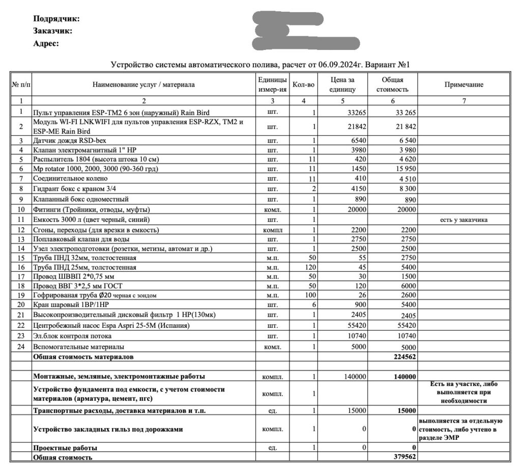 В 2025 г. передо мной встала задача сделать автополив в загородном доме. Нашел подрядчика на «Авито». Много положительных отзывов, в том числе об адекватности ценника. Для организации автополива газона площадью 160 кв. м (1,6 сотки) он посчитал мне два варианта с работой и материалами под ключ: на 400 и 300 тысяч рублей. Данная сумма не включала бак для воды, который у меня был.